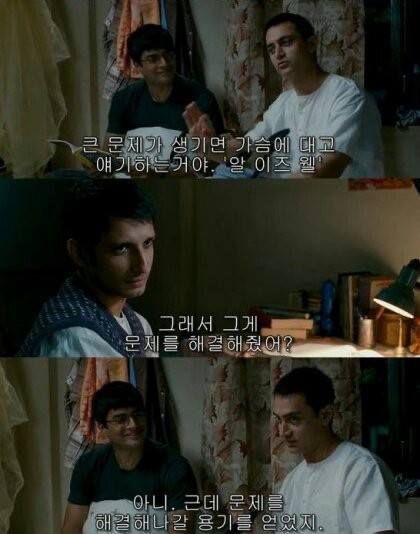 영화에서 반복적으로 등장하는 ‘알 이즈 웰(All is well)’이라는 대사는 삶에서 어려운 순간을 마주했을 때 가져야 할 태도를 상징적으로 보여준다 란초는 두려움을 느낄 때 가슴에 손을 얹고 “알 이즈 웰”을 외치면 비록 당장의 문제는 해결되지 않더라도 마음이 진정되고 더 나은 해결책을 찾을 수 있다고 말한다 이는 그저 낙관적인 태도를 의미하는 것이 아니라 문제를 피하기보다 차분하게 받아들이고 해결해 나가는 과정의 중요성을 강조하는 말이다 특히 시험과 취업이라는 압박 속에서 불안해하는 친구들에게 이 말을 건네며 두려움에 사로잡히기보다는 자신을 믿고 앞으로 나아가라고 조언한다 이는 단순한 영화 속 대사가 아니라 현실에서도 적용할 수 있는 가치 있는 메시지로 목표를 이루기 위해서는 끊임없는 도전과 긍정적인 태도가 필요하다는 점을 상기시켜준다 또한 ‘알 이즈 웰’은 단순한 위로의 말이 아니라 어려움을 극복하는 방법에 대한 철학이기도 하며 영화가 끝난 후에도 긴 여운을 남긴다